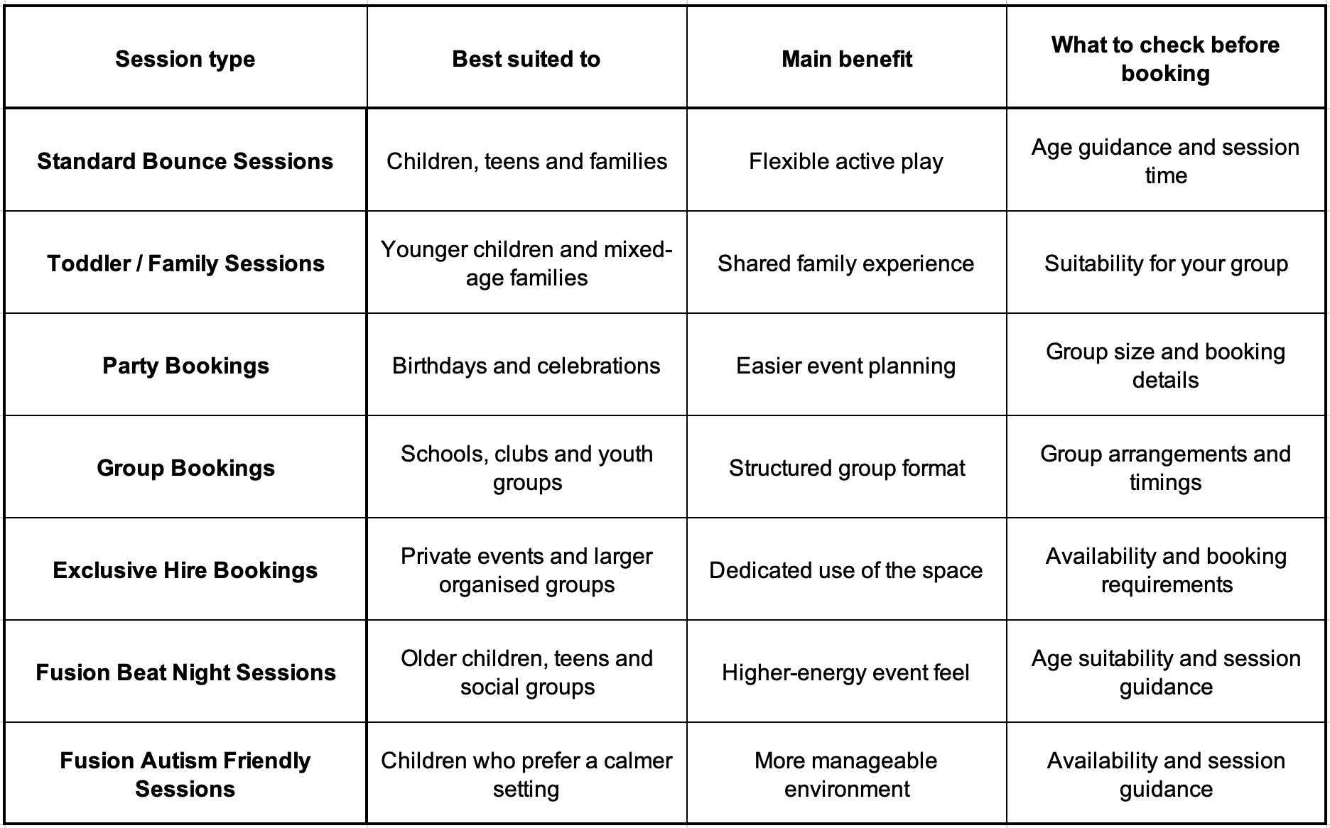 Start with your group size, the age of the children attending and the kind of atmosphere you want. From there, compare whether a Standard Bounce Session, family-focused session, party booking, group booking or quieter option is the best fit.